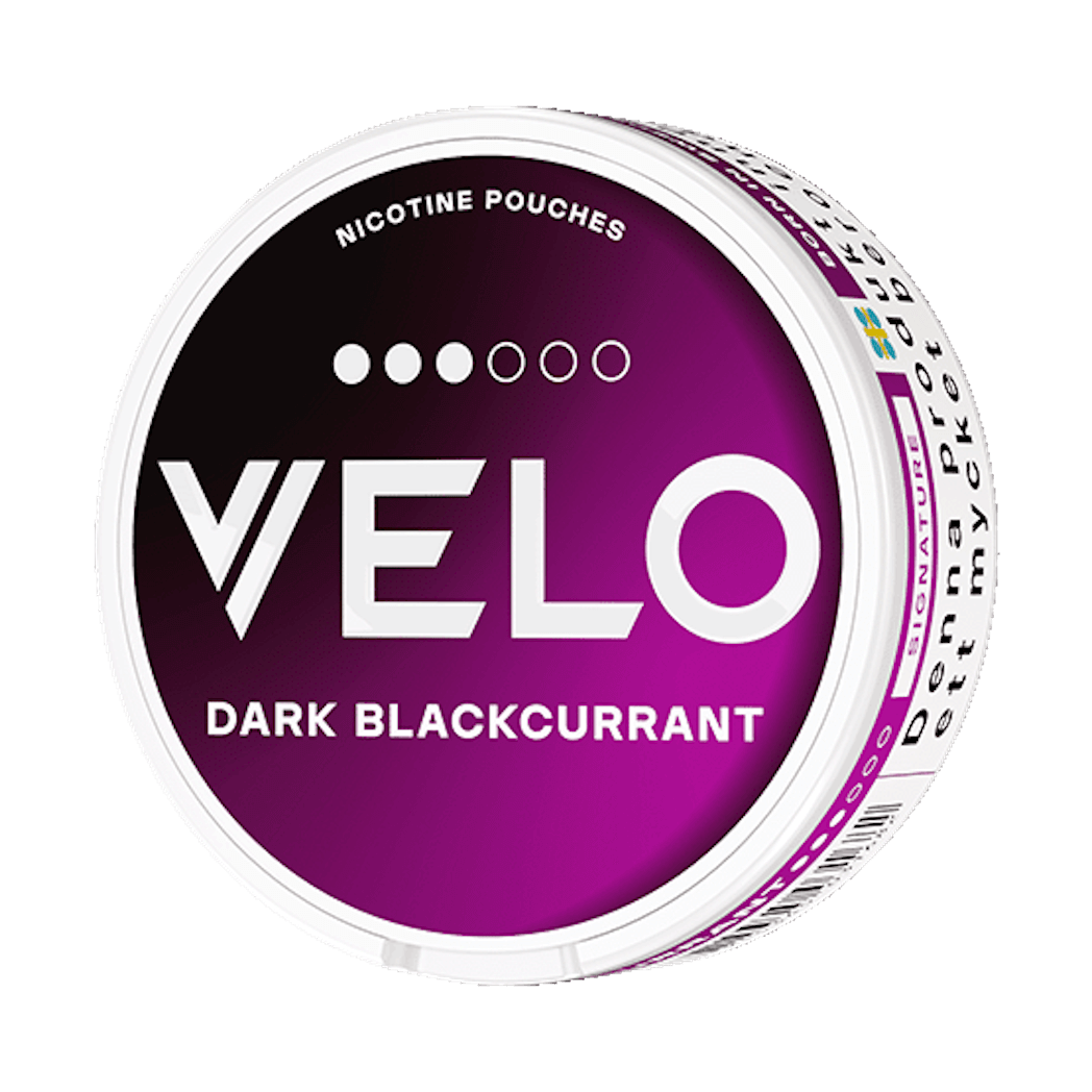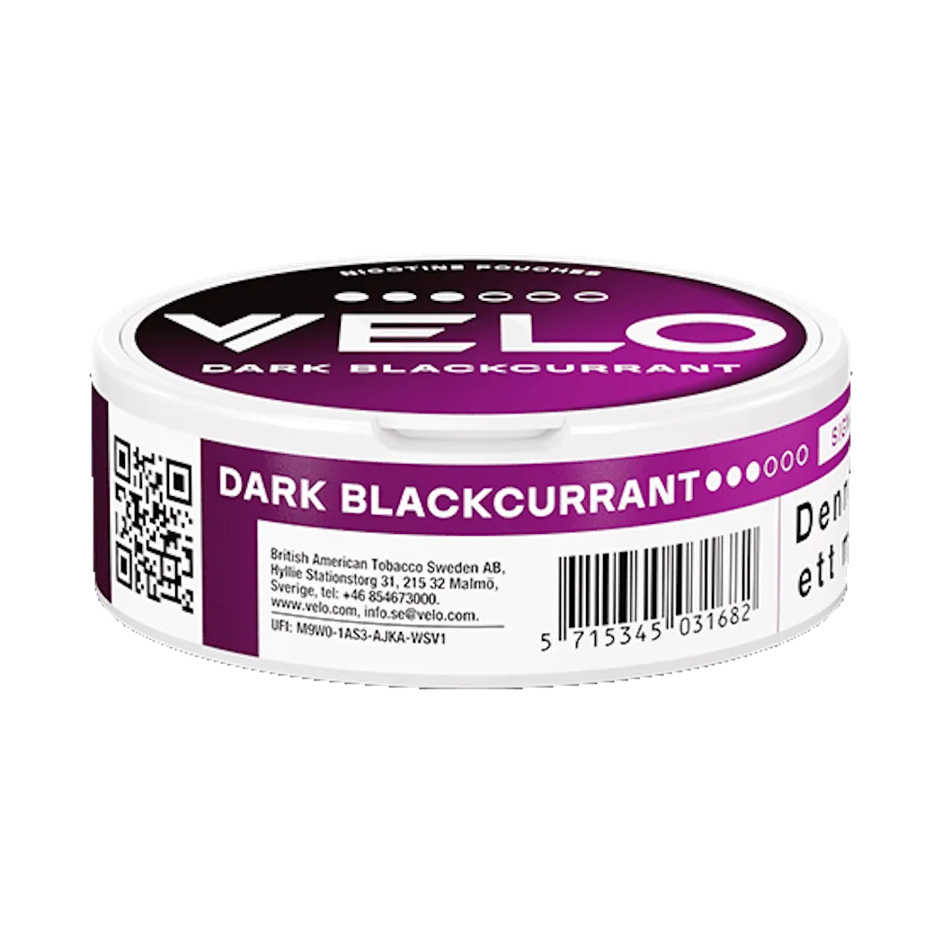 VELO Dark Blackcurrant je bílý snus ák s příchutí černého rybízu v slim balení. Tento výrobek má silnou sílu, každá porce obsahuje 8 mg nikotinu, což v přepočtu činí 11,4 mg na gram.